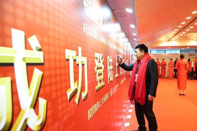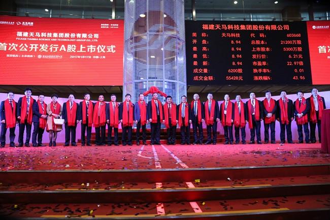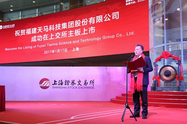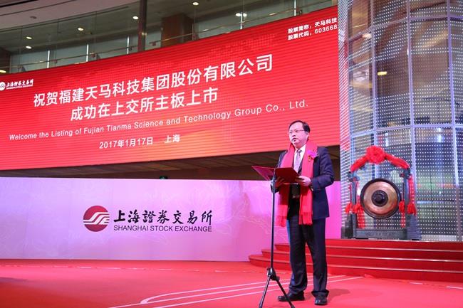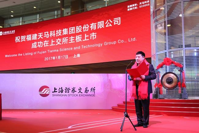 天馬科技訊 1月17日,福建天馬科技集團(tuán)股份有限公司(證券簡稱“天馬科技”,證券代碼603668)首次公開發(fā)行A股上市儀式在上海證券交易所隆重舉行。天馬科技陳慶堂董事長及福建省福清市人民政府市長張帆,福建省泉州市泉港區(qū)人民政府區(qū)長顏朝暉,海通證券總裁瞿秋平,建設(shè)銀行福建省分行副行長王東標(biāo),福清市第十六屆人大常委會主任王德玉,政協(xié)泉州市泉港區(qū)第三屆委員會主席連啟明,福清市市委常委、統(tǒng)戰(zhàn)部部長陳存楓,泉州市泉港區(qū)常委、統(tǒng)戰(zhàn)部部長陳龍津,集團(tuán)董監(jiān)高,行業(yè)協(xié)會、金融機(jī)構(gòu)、客戶代表及上市中介機(jī)構(gòu)代表等出席上市儀式。陳慶堂董事長和福清市張帆市長、上交所領(lǐng)導(dǎo)共同敲響開市銅鑼,標(biāo)志著特種水產(chǎn)配合飼料領(lǐng)軍企業(yè)、中國飼料工業(yè)協(xié)會副會長單位——天馬科技正式登陸A股市場。