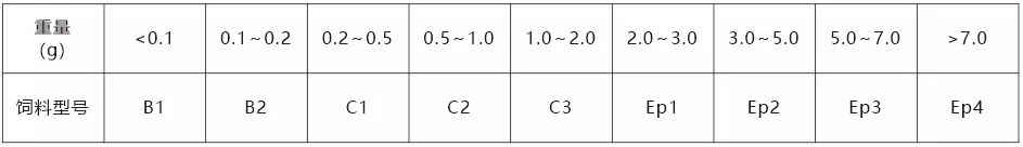 飼料適口性對石斑魚攝食及采食量產(chǎn)生很大影響,而飼料顆粒大小占飼料適口性很大一部分,在不同體重下對應(yīng)飼料規(guī)格見下表。